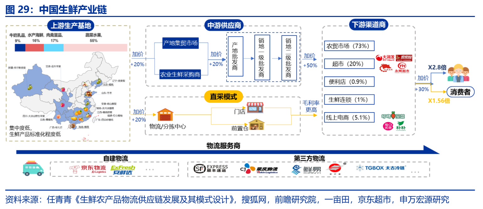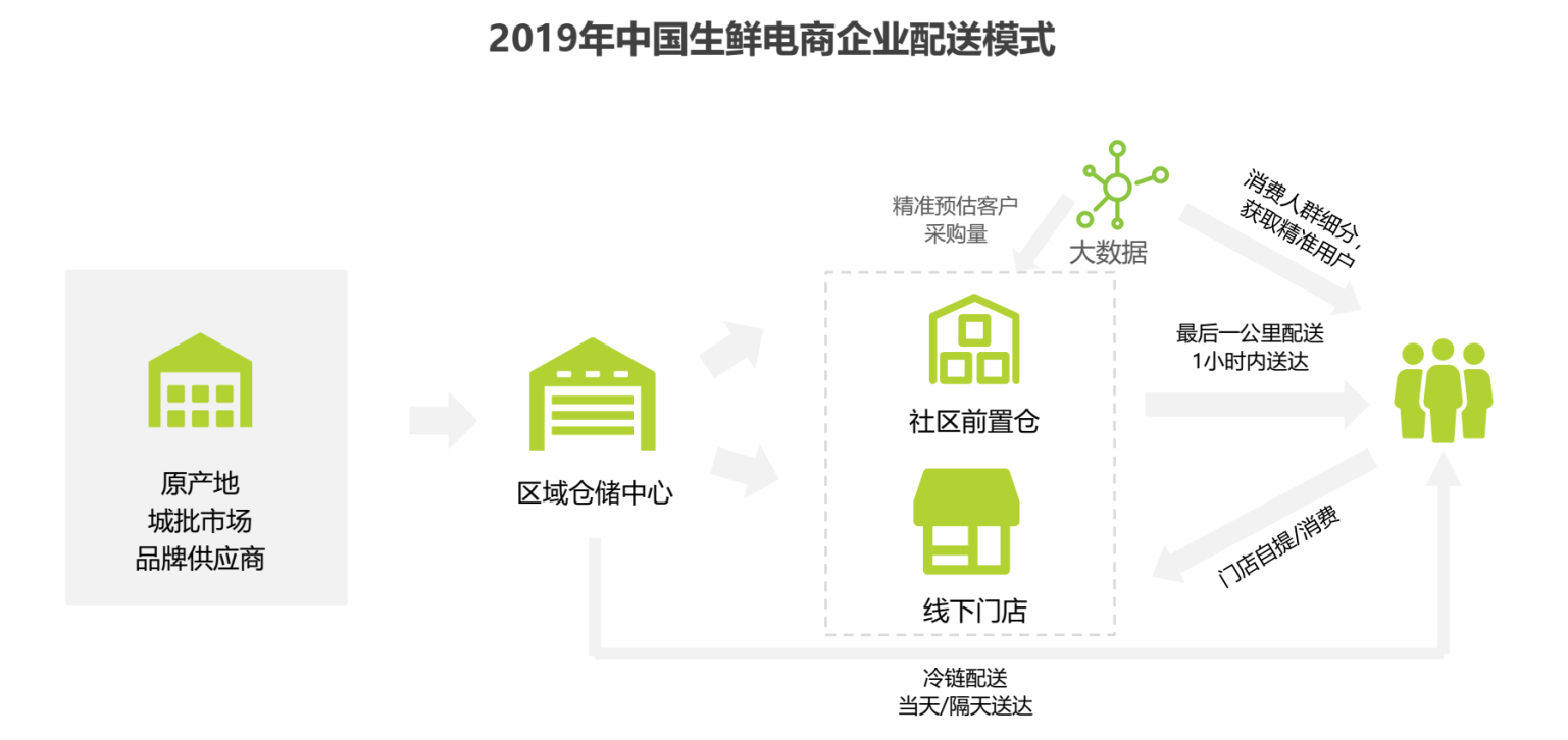 生鲜企业首先从农产品的原产地(大城市的很多产品也是从大批发市场经销商那里进货)采购产品,当然这之前在原产地上游对产品进行了分拣、清洗、初步分类包装;然后通过冷链物流运送到“区域仓储中心”,或者叫城区的中心仓,再配送到分布在各个社区的前置仓和线下的社区零售店;前置仓和线下的社区零售店的产品的需求量,是通过大数据分析和预测消费者的需求量下订单;最后周边社区的消费者就近购买或者到门店自提,或者一小时之内通过冷链车配送到小区门口,或者像“三不小菜农”一样,送菜上门,配送入户。