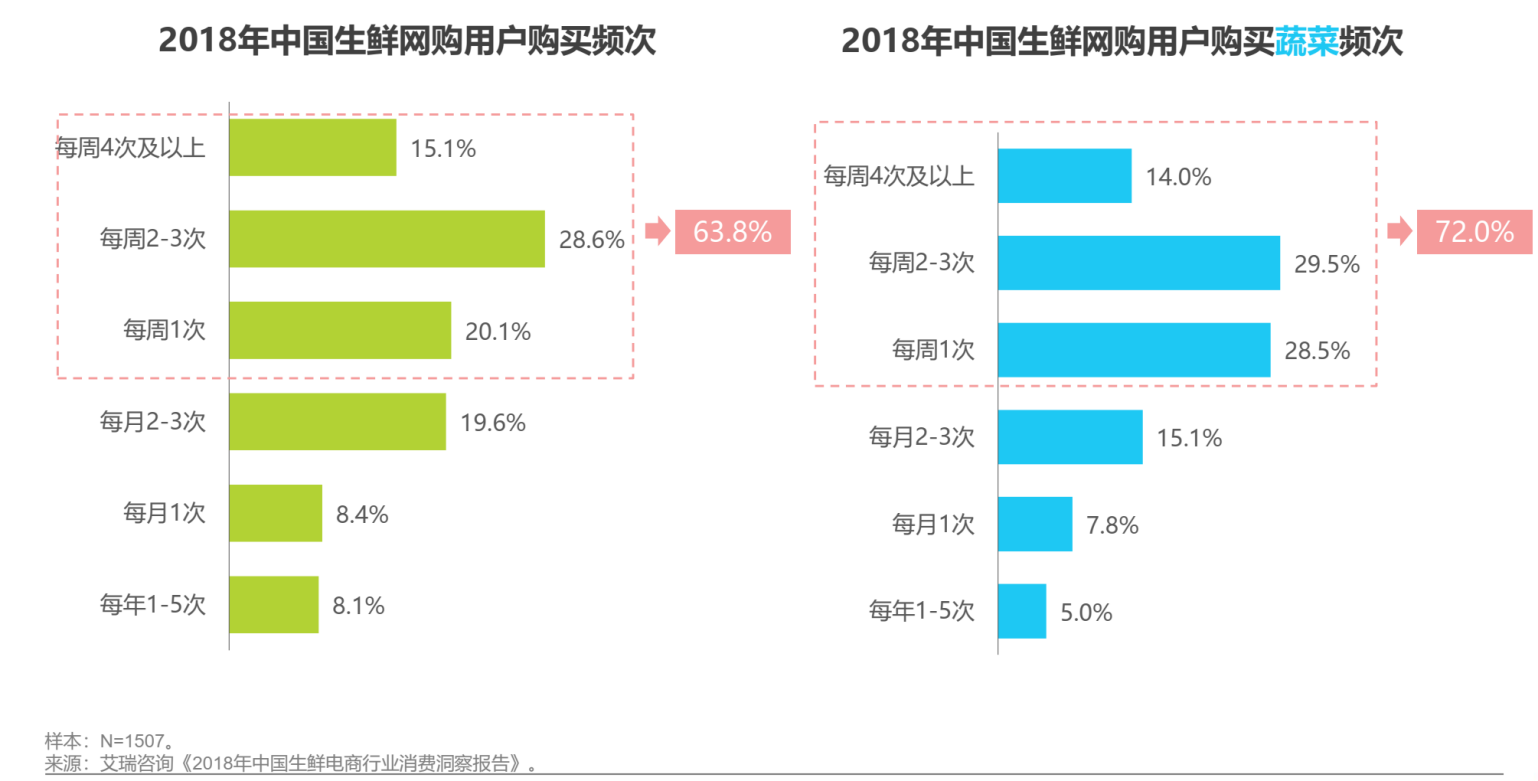艾瑞咨询的数据显示,消费者每周购买1次以上的生鲜网购用户占比达63.8%,其中,每周购买2~3次的用户占比为28.6%,现在的年轻消费者的生鲜产品消费习惯已经形成。如图5-26所示。