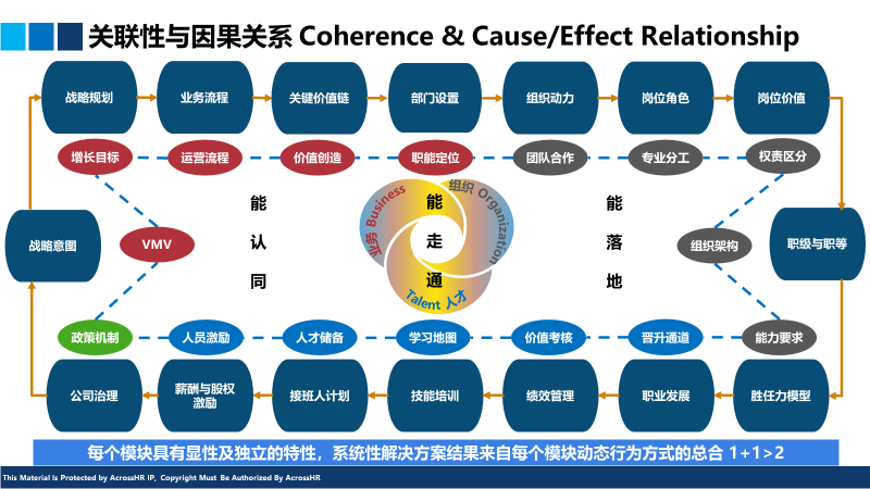 (1)最外围是第一条线,当业务战略意图明确后,从战略规划开始到业务流程、岗位角色、胜任力模型、绩效管理、薪酬与股权激励,构成了一条完整的从战略制定到战略达成路线图。