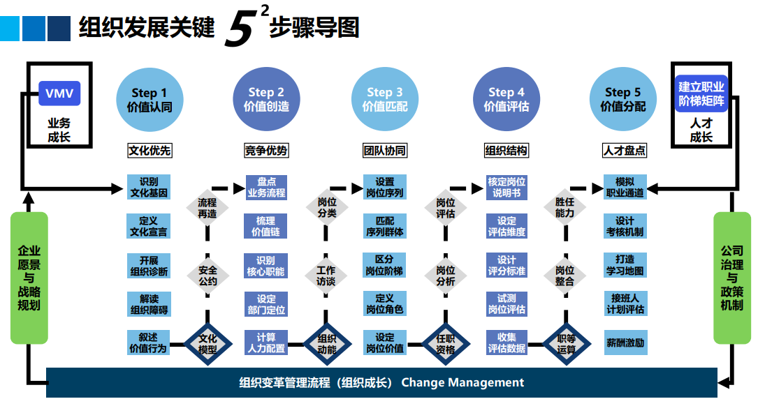 这五个步骤和具体工具的设计及交付,为人力资源管理者提供了非常明确的行动方向和执行步骤。这五个步骤从价值认同、价值创造、价值匹配、价值评估和价值分配五个方面锚定了组织管理的关键管理行为,也表达了相互关系,以及实现组织发展的阶段性目标。