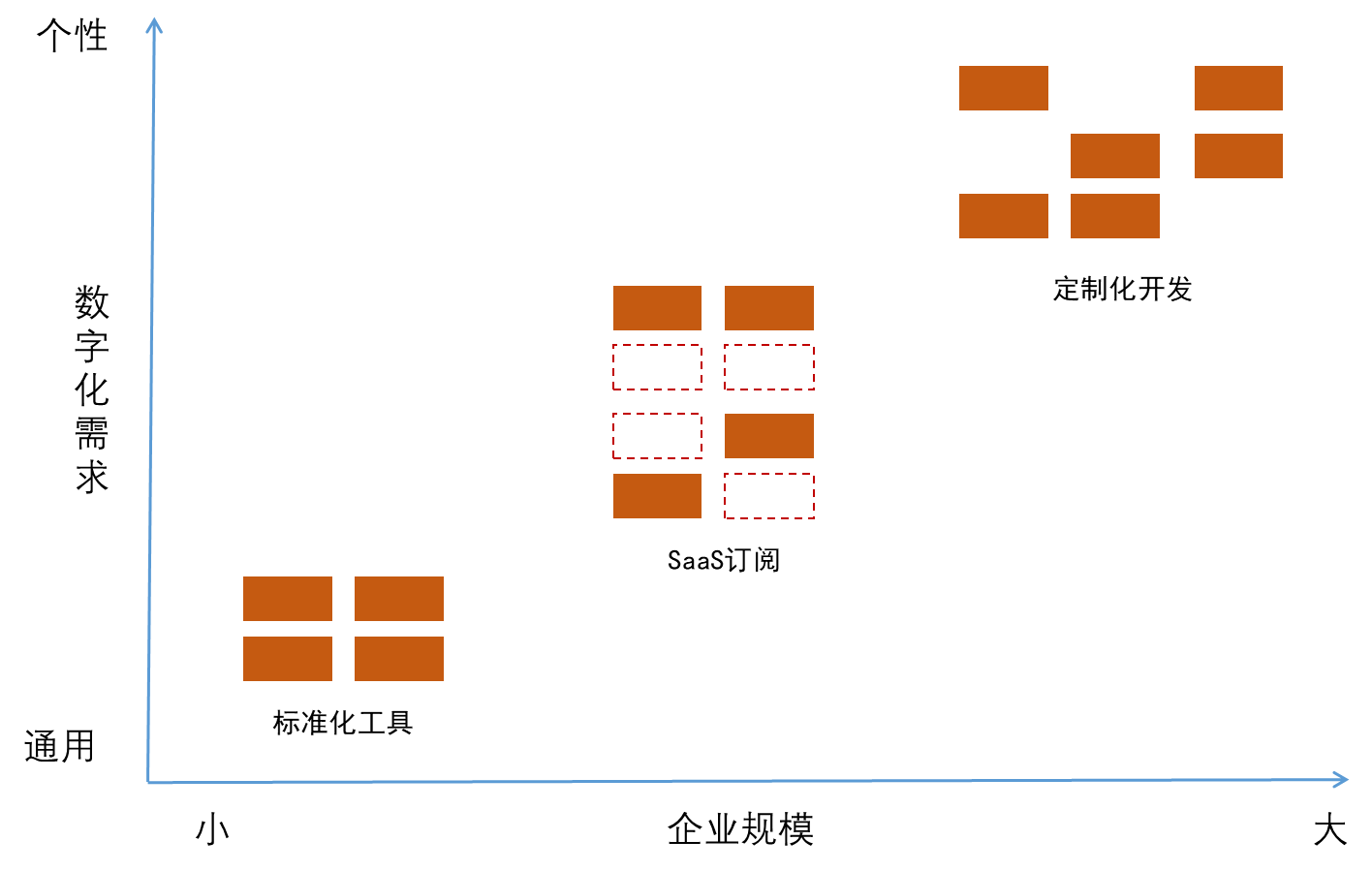 二是从专业的SaaS厂商订阅专业的数字化软件服务。SaaS厂商是数字化产业链中的专业的第三方技术服务机构,这些厂商长期深耕于某些垂直的行业领域,基于这些行业的业务逻辑、业务专业知识、业务需求痛点,构建了一系列具有针对性的软件功能模块。