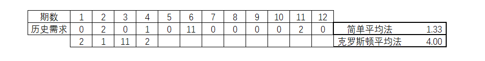 处理这种问题,最简单的就是克罗斯顿平均法。就是剔除了所有零需求之后,对此进行平均并作为下一期的预测。实际上就是一种简单的平均法。