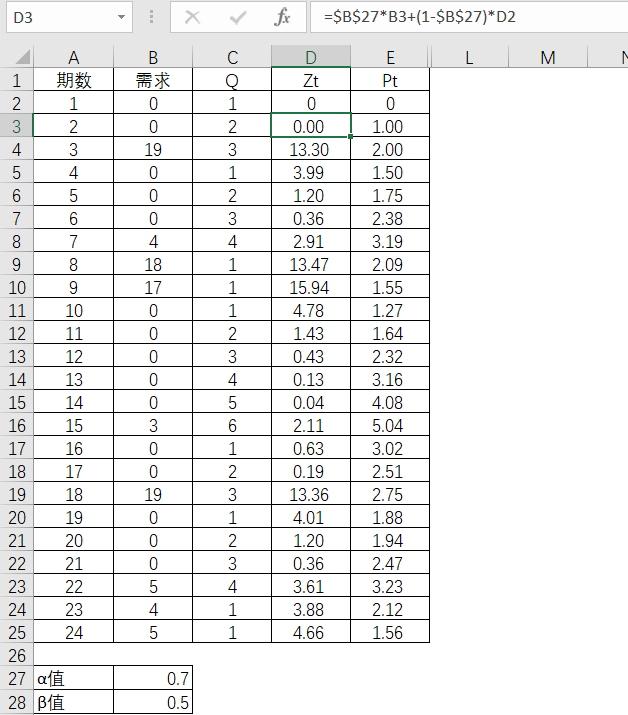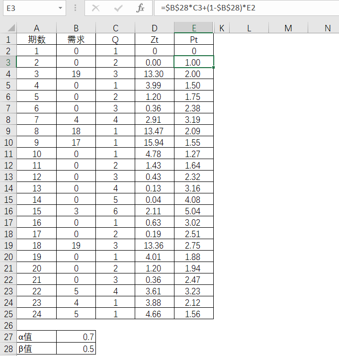 克罗斯顿预测法的第一步,要得出Q,也就是清楚每一个非零实际需求之间的间隔期数是多少。第1期初始Q为1,那么第2期实际需求还是0,所以延续计算为2,到了第3期实际需求是19,因此零需求的计算便中止,开始重新计算为1了。