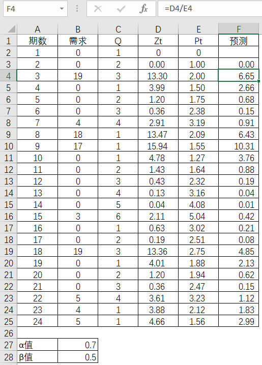 下一步就是通过t期的Z值和P值,来计算该期的预测值。如第3期的预测值则为第3期Z值除以同期的P值。
