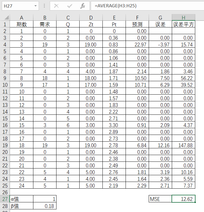 有了24期的数值,就可以通过指数平滑法对25期进行预测。假如第24期的实际值为0的时候,直接把第24期的预测值作为第25期的预测值。假如第24期的实际值大于0,则采用一数值平滑公式来计算第25期的预测值。其中平滑指数继续采用之前优化后所得的α值。