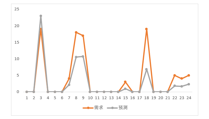 这种情况,拟合度会变得更好。其中第24期的预测值是5除以2.19,得2.29。意味着用克罗斯顿的方法,其需求预测是5个单位,时间间隔是2.19。