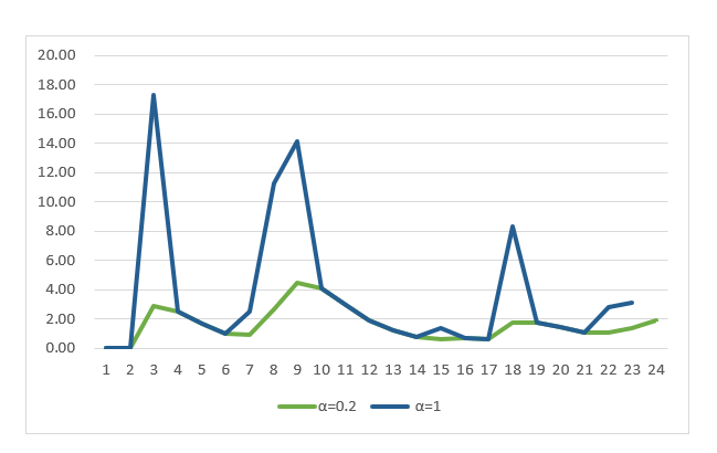 α值=1远比α值=0.2时波动激烈,因此继续以此进行一指数平滑。值得注意的是,克罗斯顿方法的β参数,是涉及时间间隔的参数,并非双指数平滑中代表趋势的β参数,因此不可套用。克罗斯顿方法实际上,也是一种指数平滑的方法,只是平滑的对象不同而已。