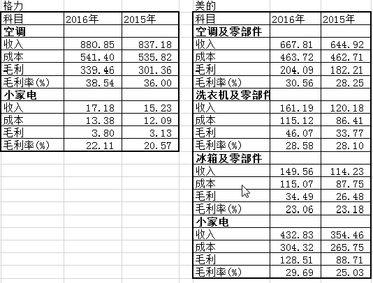 如表1-19所示,格力的收入主要是空调,2016年毛利率高达38.54%,而美的空调同期毛利率只有30.56%,差额高达8%,看来格力电器的空调竞争力强过美的集团是毋庸置疑的,这个“核心科技”带来的毛利率不止5%。当然在小家电领域,美的无论是规模还是毛利率都要强势一些,这也体现了在小家电领域,美的集团是可以称王的。