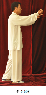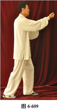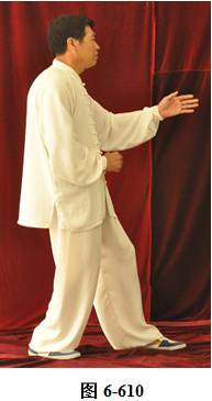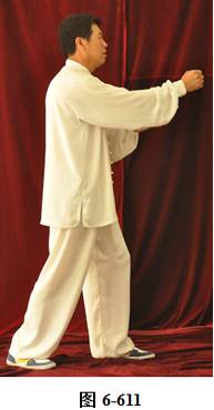 接上式,腰微拱,带动两拳向右肋下划弧回撤,重心微移至左腿,左膝微屈。同时右拳翻转拳心朝上;左拳变掌,掌心搭在右拳腕部,向右前下打挤。腰上提向左旋转,两臂打开略窄于肩,随向前向左里回划弧,右拳心朝上,左掌心向下,运转至右膝前,两手与右膝成三角,渐渐成右弓步;左腰微提,带动左脚提起向前迈步;腰微含向右转,身体随之渐渐微右转,随即向左转。随转体,右拳自右肋旁而上,经胸前向前搬出。随着臂外旋使拳眼慢慢翻转朝上, 随即渐渐向下弧形抽回,拳心朝左;左掌同时随转体,弧形向右经右臂里侧旋翻前拦,掌心朝右,成左弓步;腰微含,重心稍移右腿,随即腰向上提,右拳随之打出,左手回拉至右小臂里侧停置右腕部(见图6-607至6-611)。