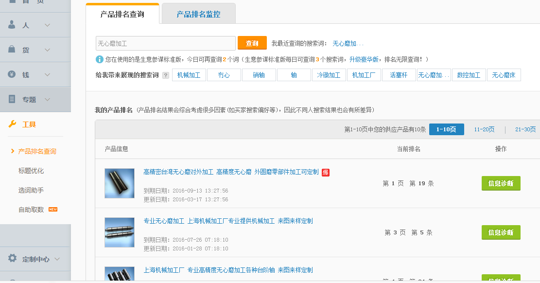 产品排名查询,选择我定制的搜索词或者给我带来展现的搜索词进行搜索,普通用户一天只可以选3个词,选好之后可以查询几款产品在阿里巴巴的排名情况,如图9-42所示。