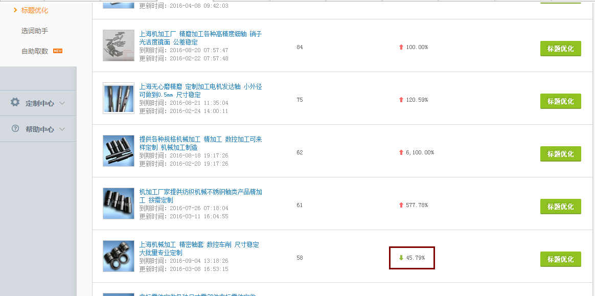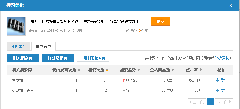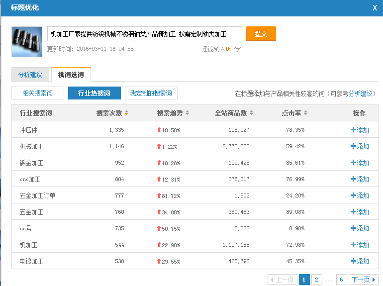 比如说,我选中了轴类加工,那么我点击添加就会出现在标题中!这里有个技巧,那就是要选择搜索趋势高、点击率高、商品数少的词。