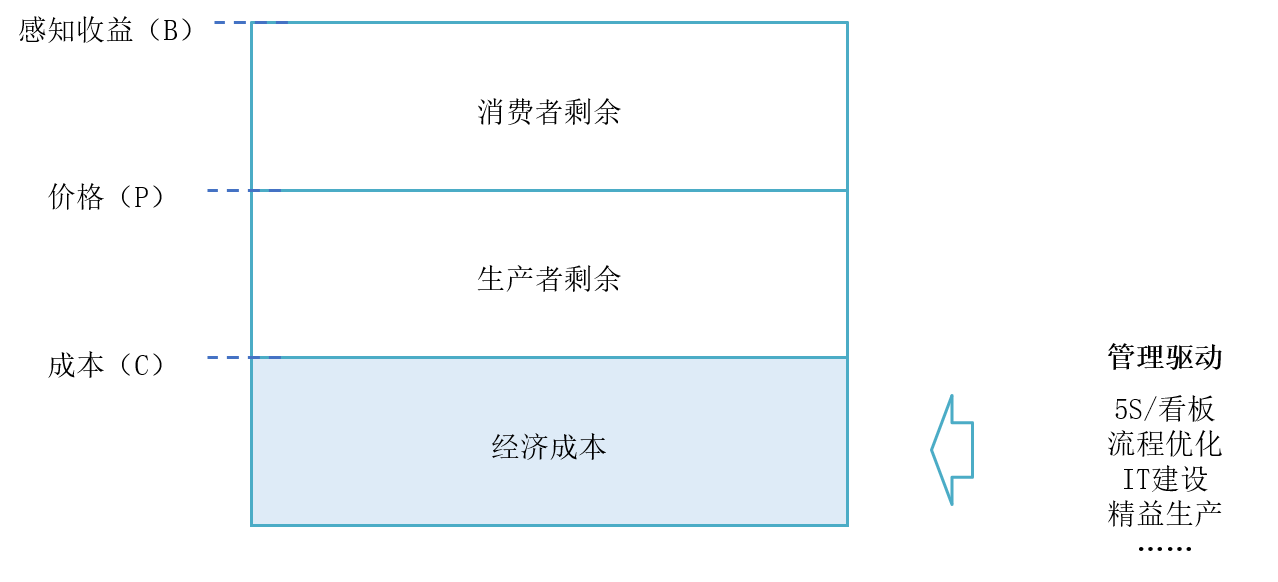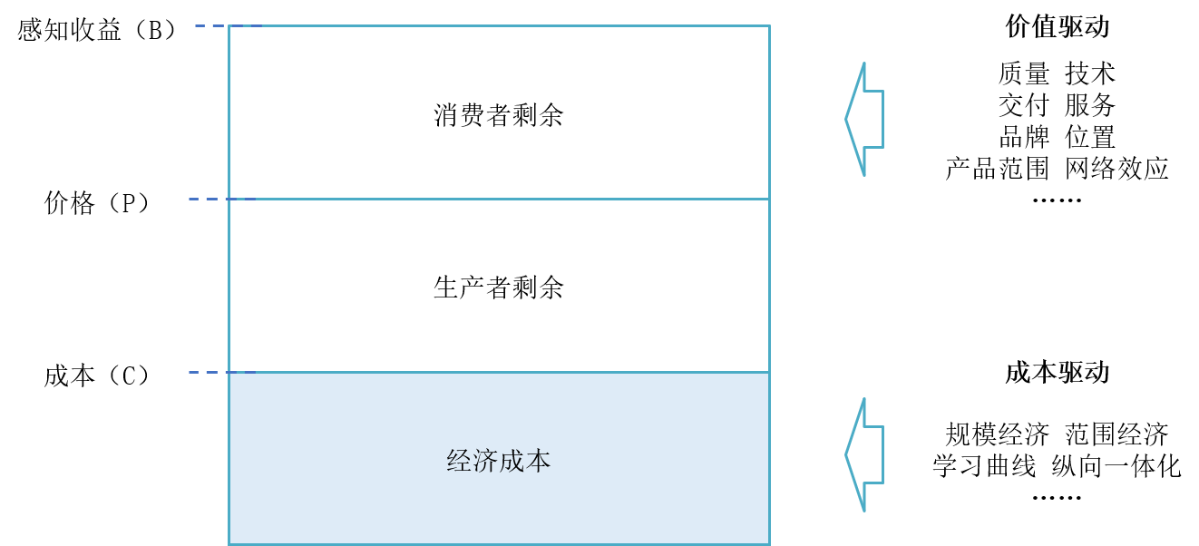 ②战略创新,在增加消费者感知收益的情况下(例如手机增加双摄拍摄、AI智能),进一步降低成本,企业也获得了更大的收益(消费者剩余、生产者剩余都增加)。