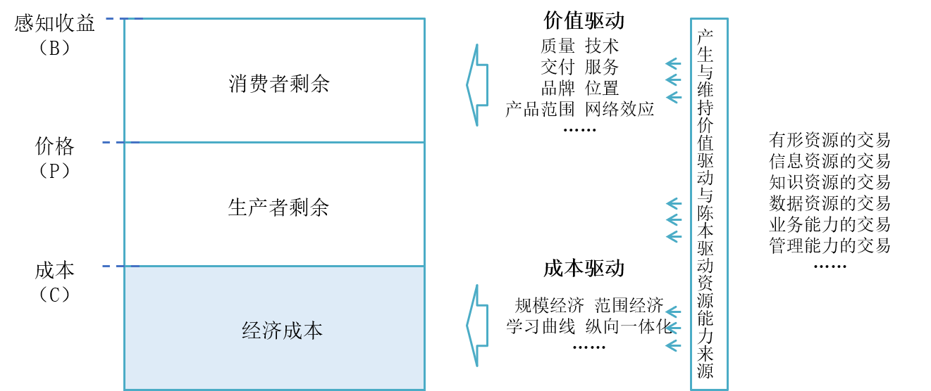 对于第一个任务,一般来说,任何能够提高客户(感知)价值或者降低经济成本并促进公司市场地位的方面都是思考的方向,与管理驱动相比,我们可以分别称之为“价值驱动”和“成本驱动”(其价值创造逻辑如图11-11所示)。