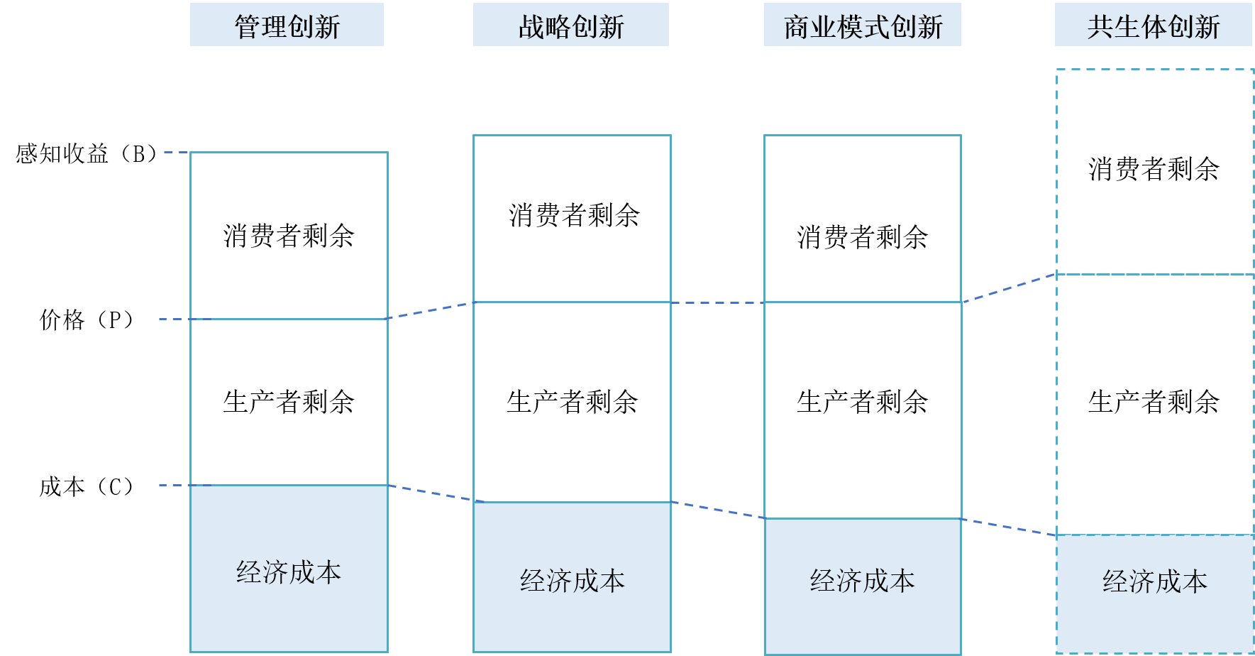 ③价值网创新,可能不增加消费者剩余(例如手机依然保持同样的配置),但是通过资源和交易得到进行了重新配置,经济成本可能进一步下降,生产者剩余增加。