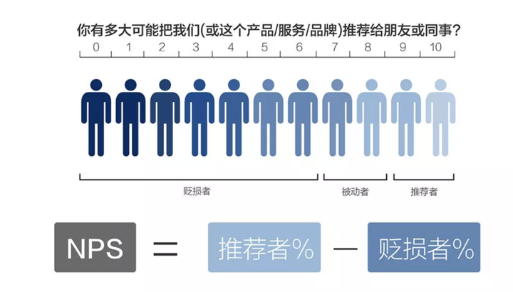 净推荐值NPS=(推荐者数/总样本数)*100%-(贬损者数/总样本数)*100%