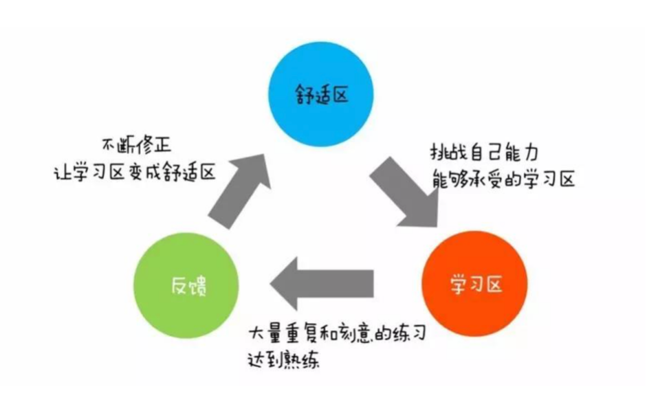 4) 刻意练习的过程就是走出舒适区的过程,要从“舒适区”去寻找自己可以承受的“学习区”,在“学习区”通过大量的刻意练习,不断的“反馈”正向能量。强大新的认知,最后让“学习区”变成新的“舒适区”,我们就实现了头脑的升级,不过还需要不断的强化,再次进入“学习区”,让自己实现螺旋上升。