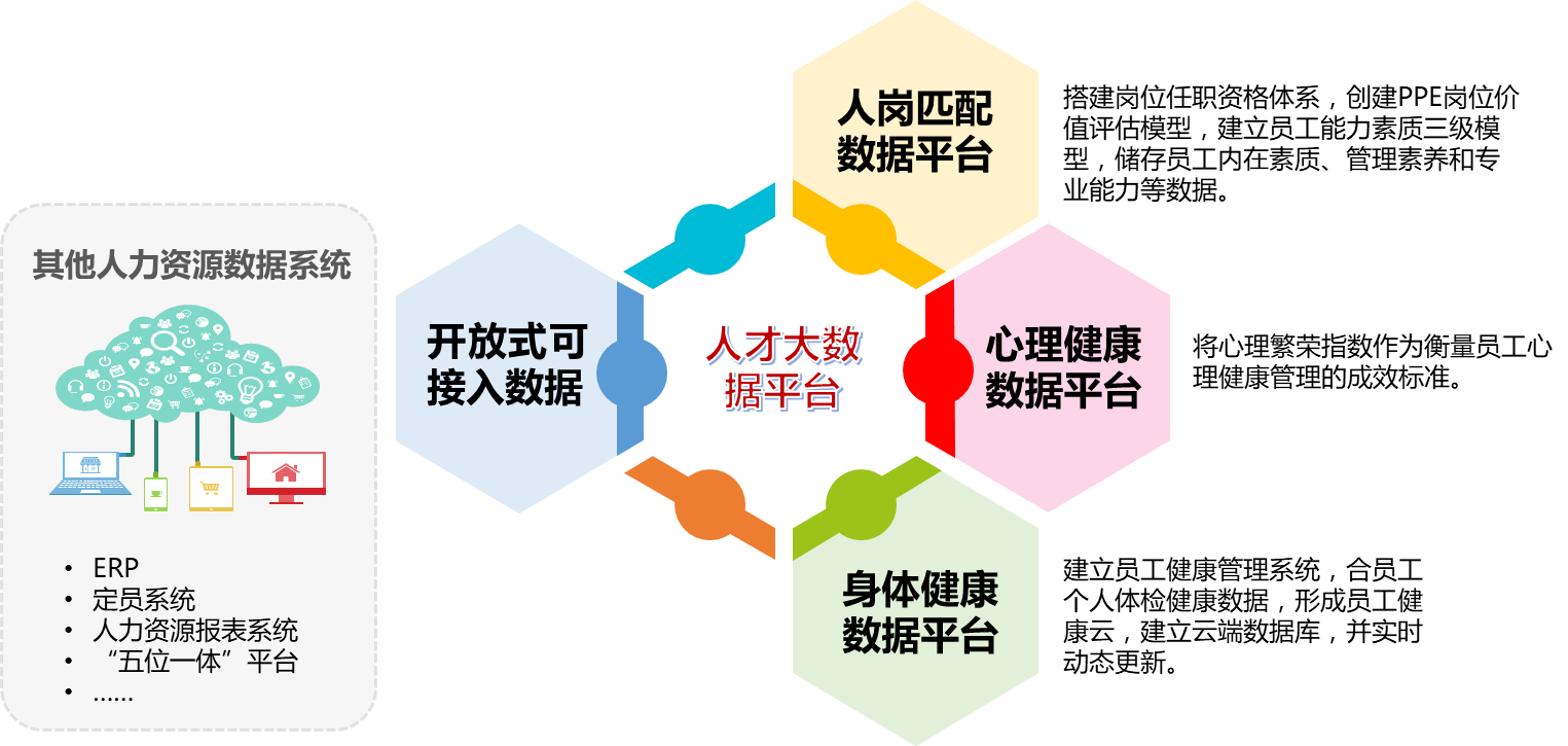 人才大数据平台包含的子系统包括人岗匹配数据平台、心理健康数据平台、身体健康数据平台以及开放式可接入的数据系统,它们共同构建了基于“身心岗+”的“四位一体”人才大数据平台。