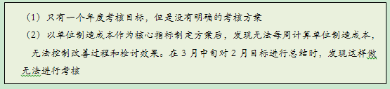 :管理变革前,BJH公司以单位成本作为核心指标制定考核方案,但后来发现财务不可能把每一天每一周的单位制造成本都算出来,这样大家也就不知道一周下来动作做的到底有没有效果,也就是无法控制改善过程和检讨效果。在3月中旬对2月份目标进行总结时,大家发现这样做没有办法进行考核。