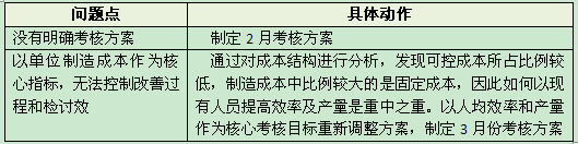 :变革前,企业只有一个年度考核目标,就是老板提出的目标,也就是单位制造成本要下降33.3%。有年度考核目标,但没有明确的考核方案,目标没有分解到月,每个月要达到多少,又怎么进行考核,没有相关规定。