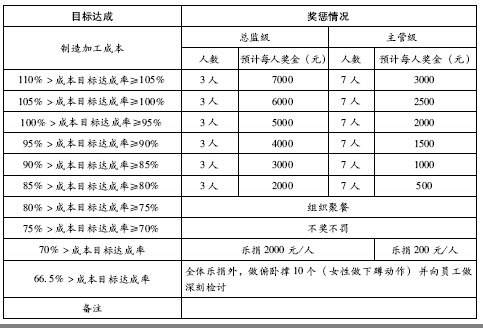 成本目标达成低于65%,除以上乐捐外,全体人员向生产员工进行检讨,并当场做俯卧撑10个(女性做下蹲动作)。