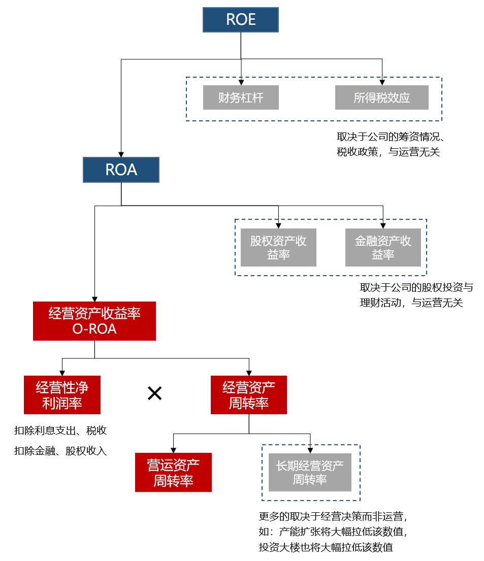 如果将经营资产收益率(O-ROA)再往下进一步拆分,便可分为经营性净利润率和经营资产周转率。其中,经营资产周转率根据资产的变现回收期限又分为营运资产周转率和长期经营资产周转率。而长期经营资产周转率更多取决于上市公司的经营决策而非企业运营,比如企业的产能扩张、投资大楼等都有可能大幅拉低该数值。最后,净资产收益率(ROE)整个拆解过程汇总如图8-28所示。