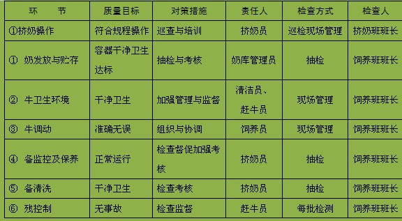 (2)牧场质量目标:执行公司目标,对牛奶生产过程进行控制,以确保牛