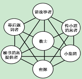 阿伦·肯尼迪对这一网络进行了较为详细的描述。阿伦·肯尼迪认为企业文化网络中存在着“讲故事者”“教士”“密探”“幕后题词者”“秘书消息提供者”“小道消息提供者”和“小团体”等七种典型的文化角色,他们构成了文化网络中的主要载体,是文化网络中最活跃的份子。如图2-5所示。