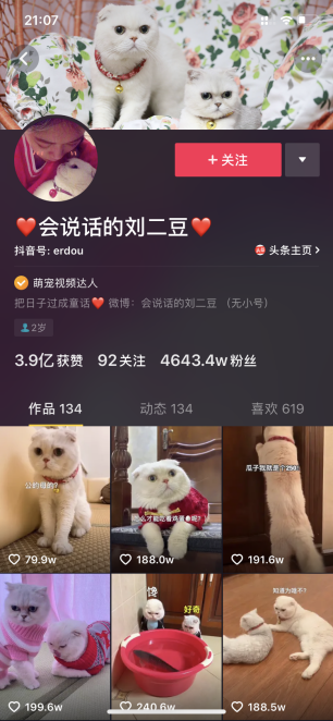 比如“多余和毛毛姐”,一个男生同时扮演男女两个不同的角色,自己与自己进行对话和沟通,没想到女版人物比男版人物更受粉丝欢迎。抖音账号“乔万旭”,主播也是一个人扮演多个角色,很受欢迎。抖音里很多男生化妆变美女的视频,都很受欢迎,比如“阿纯”。动物与人的角色互换,代表账号是“会说话的刘二豆”“金毛蛋黄”等。语言模仿,参考“张大仙”。角色扮演的账号如图5-18所示。