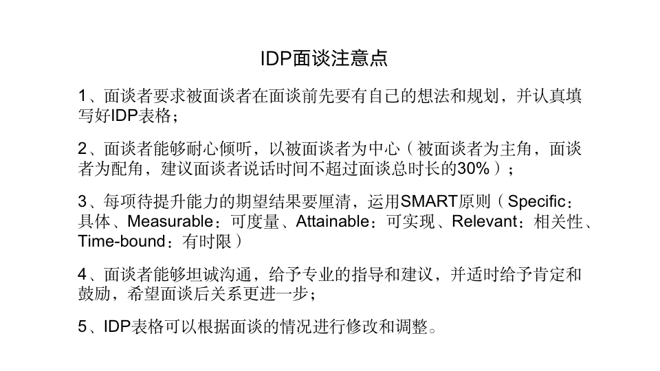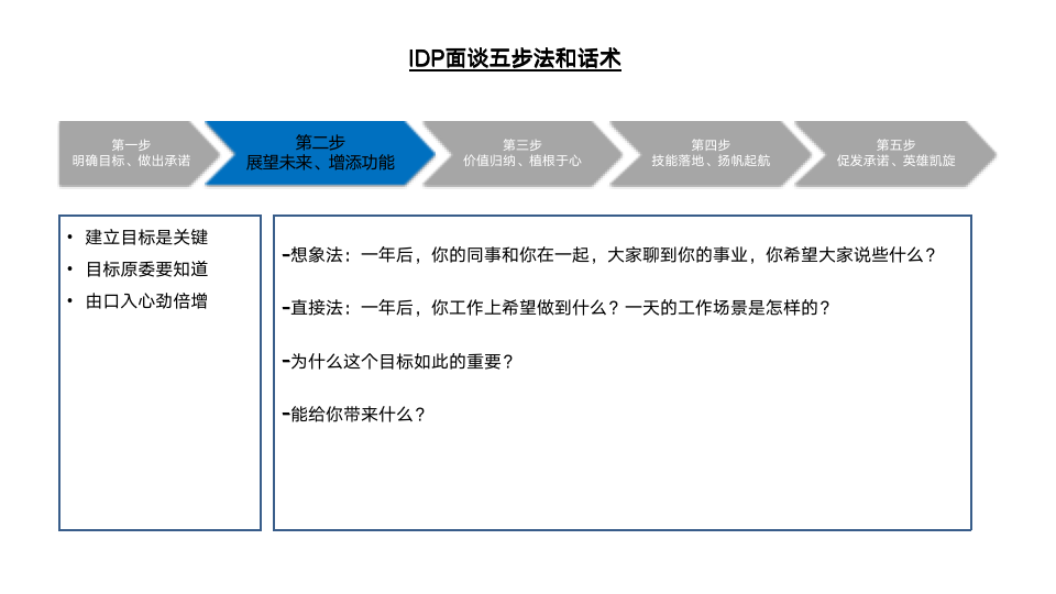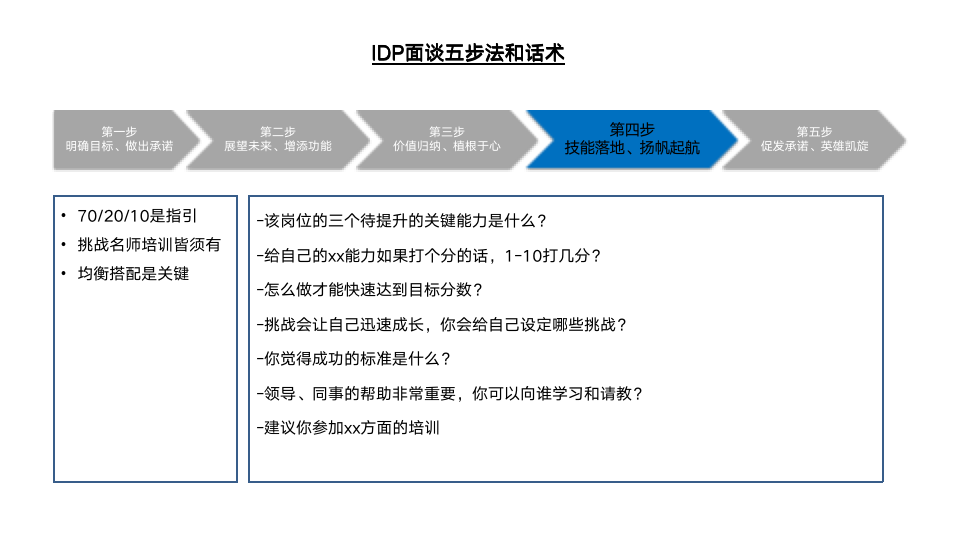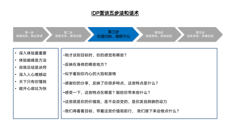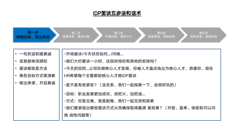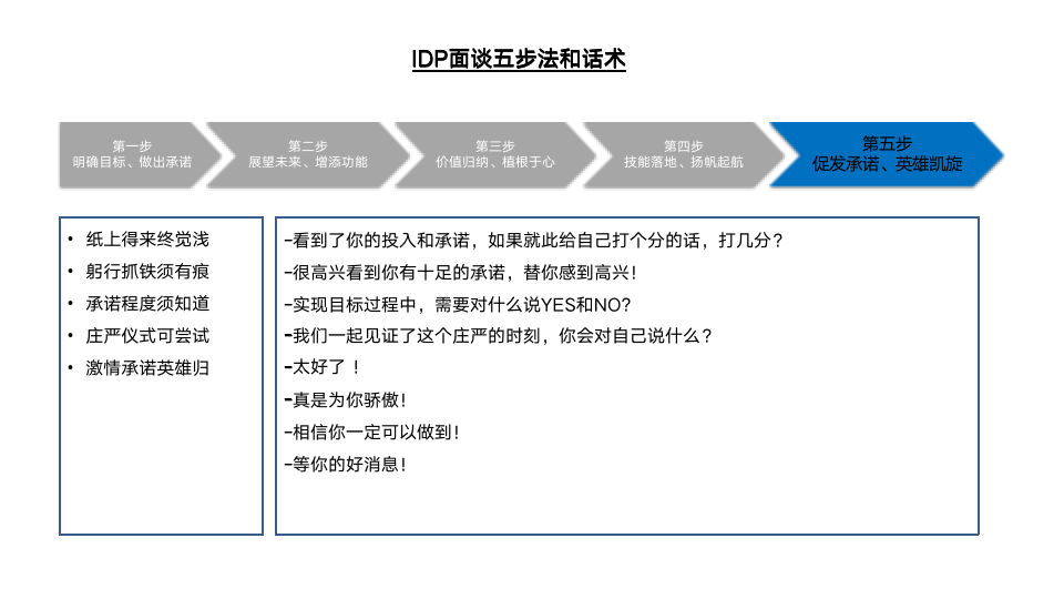 为此,我们设计了IDP面谈五步法的现场演练环节。首先,介绍了IDP五步法的操作流程及注意点,如图6-7所示。