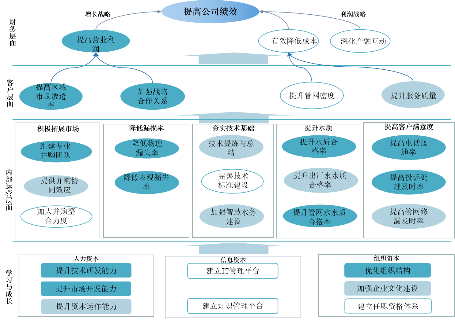 战略解码之后,还需要进一步转化成具体的行动方案、衡量指标及目标值,首先使用战略地图从财务、客户、运营,以及学习与成长四个角度对上述战略规划进行描述(本报告仅分析供水业务)。