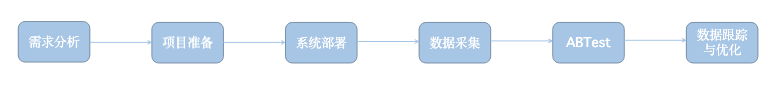 我们先讲本地化部署模式,也就是第三方服务商将整套推荐系统部署于企业方服务器。需求分析自然必不可少。项目团队在第三方服务商的配合下确定好服务器等硬件,便可以直接进行系统的部署。一般来说,成熟的第三方服务商的产品已不需要再进行现场开发,现有产品的推荐功能要求可以满足绝大部分客户及场景的需要,并具备较为完善的解决方案,只需要针对客户推荐需求的梳理将未包含部分进行定制开发即可。那么企业在系统上线的过程中需要参与的是:需求分析—项目准备(主要是服务器、配合人员和验证目标)—系统部署—数据采集—监控AB Test效果—数据跟踪与优化。如图2–3所示。