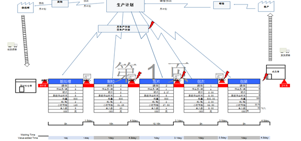 这家公司的在制品库存接近一个月,平均是23.6天,项目组构建了价值流图如图12-6所示。