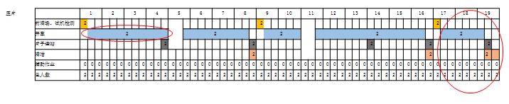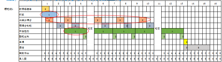 2)制粒工序:当前有2条产线,每条线5名员工,每条产线做1个批号,需要2个班次,进行了人机联合分析,发现人员空闲时间较多。每批产品大约15个小时就可以完工。如图12-6所示。