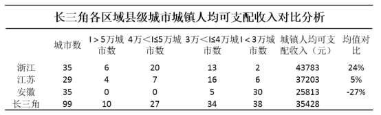 长三角县域城镇人均可支配收入为35428元,其中浙江高于长三角平均值24%,江苏高于长三角平均值5%,安徽低于长三角平均值27%。