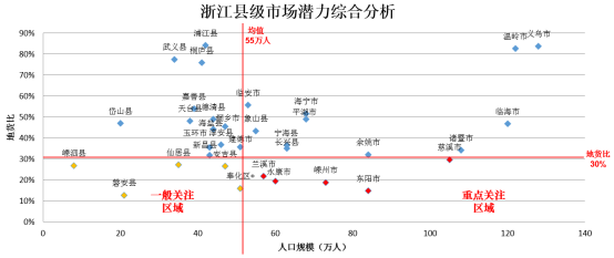 从市场潜力看,浙江县级城市应重点关注东阳市、嵊州市、永康市、兰溪市、慈溪市;一般关注磐安县、奉化区、安吉县、仙居县、嵊泗县,以上城市均具有较大潜力。