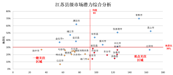 从市场潜力看,江苏省县级城市应重点关注启东市、滨海县、东台市、丹阳市、如皋市、宜兴市、射阳县;一般关注仪征市、海门市、响水县、大丰市、海安县、高邮市、建湖县、太仓市、句容市、扬中市。