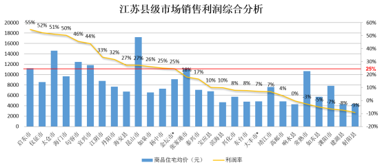 从销售利润率看,40%以上的有启东市、仪征市、太仓市、海门市、句容市、宜兴市;30%以上的有江阴市、丹阳市等地均具有较大潜力。销售利润率=(房价-地价-土地外成本)/房价,土地外成本按3500元估算。