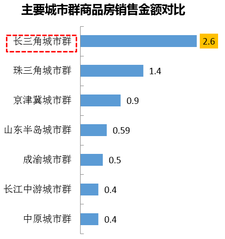 而从商品房销售金额对比来看,长三角城市群商品房销售金额为2.6万亿元,居城市群首位,远高于其他几个城市群,房地产市场成熟度高。