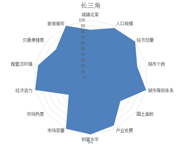 从城市群投资潜力雷达图可以看出,长三角城市群是国内最具有发展潜力的城市群,除了房地产热度维度控制较好外,整体14个维度均有领先优势。