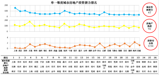 我们从城市发展潜力、房地产市场热度、投资安全性三个单一维度给出城市群各城市排名情况如下图: