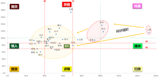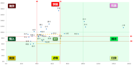 根据九宫格阶梯筛选法则,处在阶梯阴影区为重点拓展城市:黄线框内的重点拓展城市,主要包括盐城,金华、南通、宁波、湖州、绍兴、芜湖,泰州;挑货区重点拓展城市有铜陵、滁州、宣城;嘉兴、常州处在快销区,应注意防控风险。