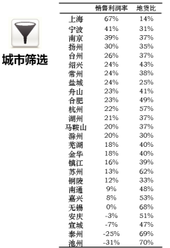 以行业领先房企投资评审标准作为筛选器,池州、泰州、宣城、安庆、无锡等城市销售利润率为负,除战略考量外,能不进驻则不进驻;嘉兴、南通、铜陵及苏州城市平均销售利润率低于15%,应关注市场风险,重点把控好获取土地位置及价格。