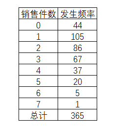 某饮料过去一年的销售数据,其中有44天并没有发生销售,而有105天则每天有1瓶的销售发生。