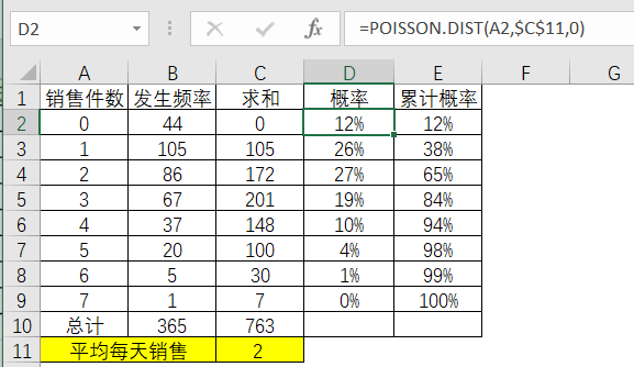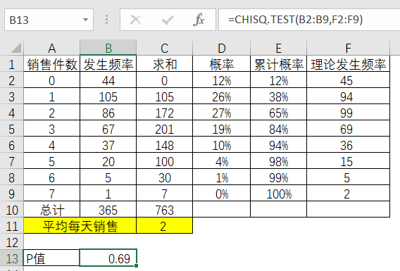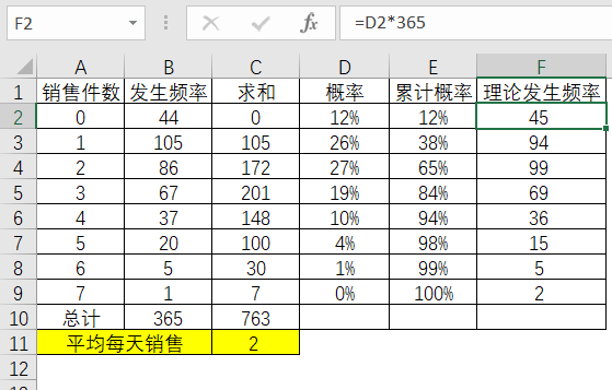 根据每个销售件数的概率乘以365天来计算对应的理论发生概率。
