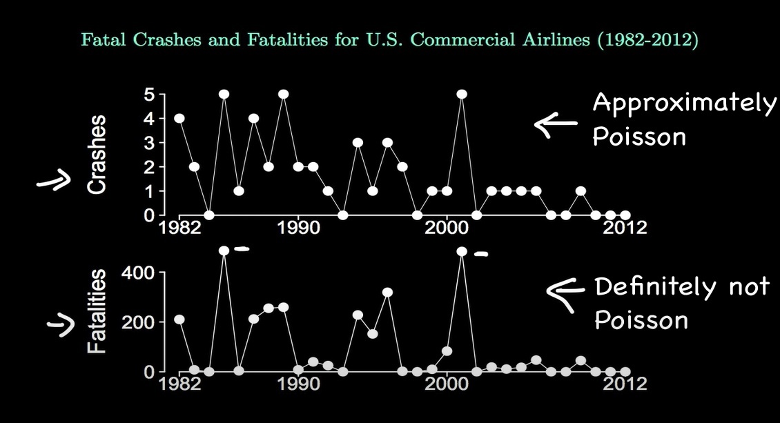 下图是美国航空公司同一个时间段内发生碰撞和死亡的分布数据,其中第一行的碰撞数据分布是符合泊松分布,而第二行的死亡数据则不符合,虽然两者的数据分布都有出现0数据的情况,但这种数据分布并非理所当然地认为是泊松分布。