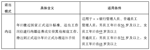 在系统梳理已有的退出管理办法的基础上,结合自身对退出机制的理解和经验,针对××银行管理人员、普通员工的退出机制进行了系统思考,坚持绩效杠杆与年龄杠杆两个原则,设计适用不同类别人员的退出机制。