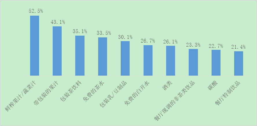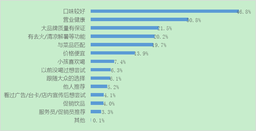 餐饮门店因经营方式迥异,而就餐人群不同,对产品的需要也不一样,产品既要营养健康,口味、包装、规格、定价又要满足不同餐饮门店消费者的需求。我们先来看消费者在餐饮门店对饮料的选择: