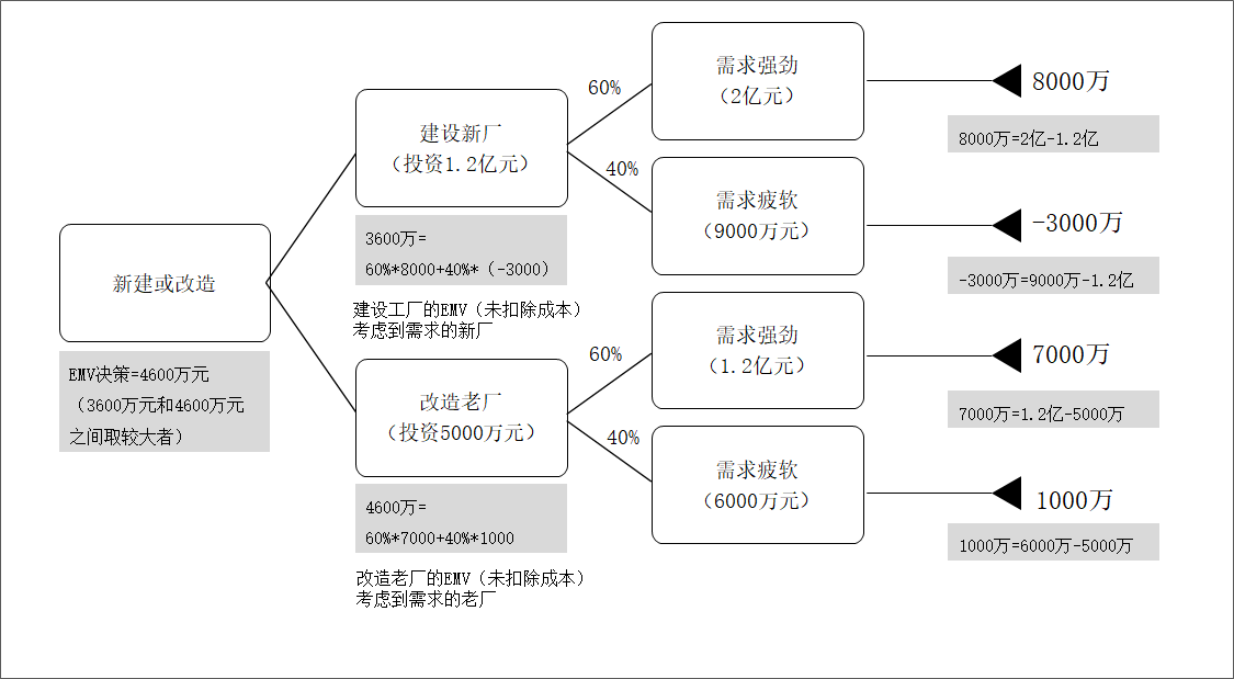 比如某单位想要实现企业效益升级,有建设新厂和改造老厂两种方案。采用决策树分析,如图7-2所示。可以看到,建设新厂的EMV为3600万元,改造老厂的EMV为4600万元,3600万元<4600万元,所以改造老厂收益更大,是更优的选择。