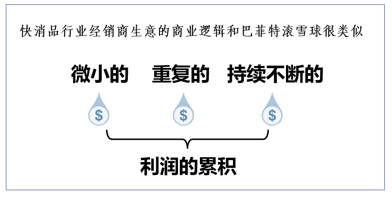经销商是伴随着快消品行业发展而应运而生的中间商群体,他们依靠代理某个或多个厂家的品牌通过进货和出货的差价来赚取利润,而快消品行业的经销利润看上去很小,但实际上非常可观,因为这个模式和股票投资里面的价值投资流派非常类似。说到价值投资,大家一定会快速想到巴菲特,他一直坚持的投资理论告诫世人:“一个人做投资一定要找到一条很长很湿的斜坡来滚雪球。”国内快消品经销商这门生意已经被验证是完全符合巴菲特这套逻辑的。如图1-4所示。