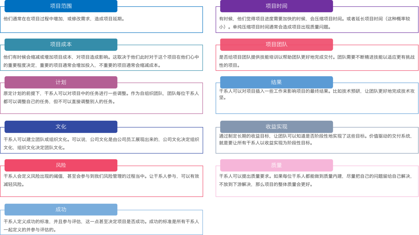 (3)干系人的加入,更加有利于项目主动地推进我们的价值交付,说得直白一点,会让我们的交付更有价值。把用户拉进我们的项目组,随时倾听用户的想法,并作出改善,是我们取得价值的关键。